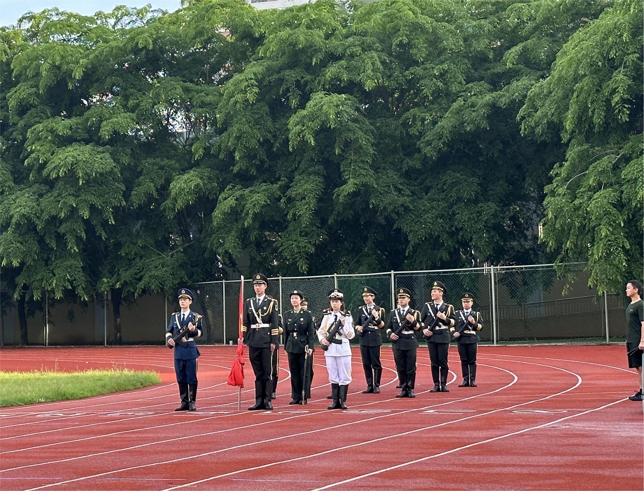 7点整,升旗仪式准时开始。伴随着国旗护卫队队长嘹亮的口令,海南医学院国旗护卫队以挺拔的身姿、整齐的步伐,一路护送国旗至旗台。国歌奏响,全体师生齐唱国歌,五星红旗在庄严肃穆的氛围中冉冉升起。