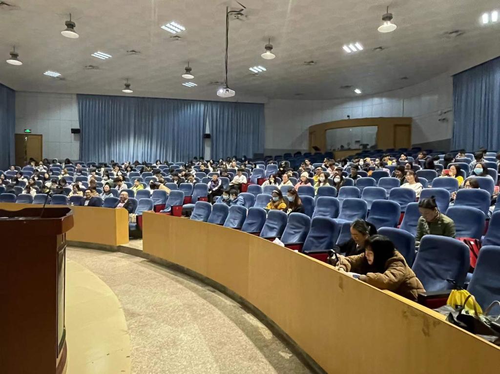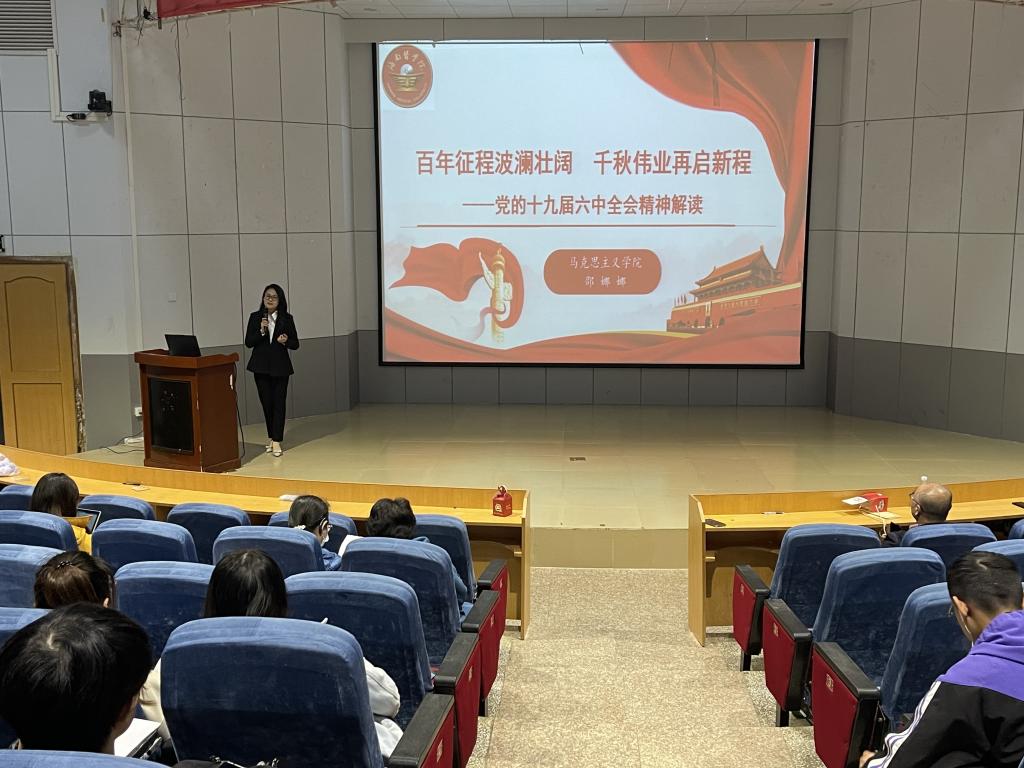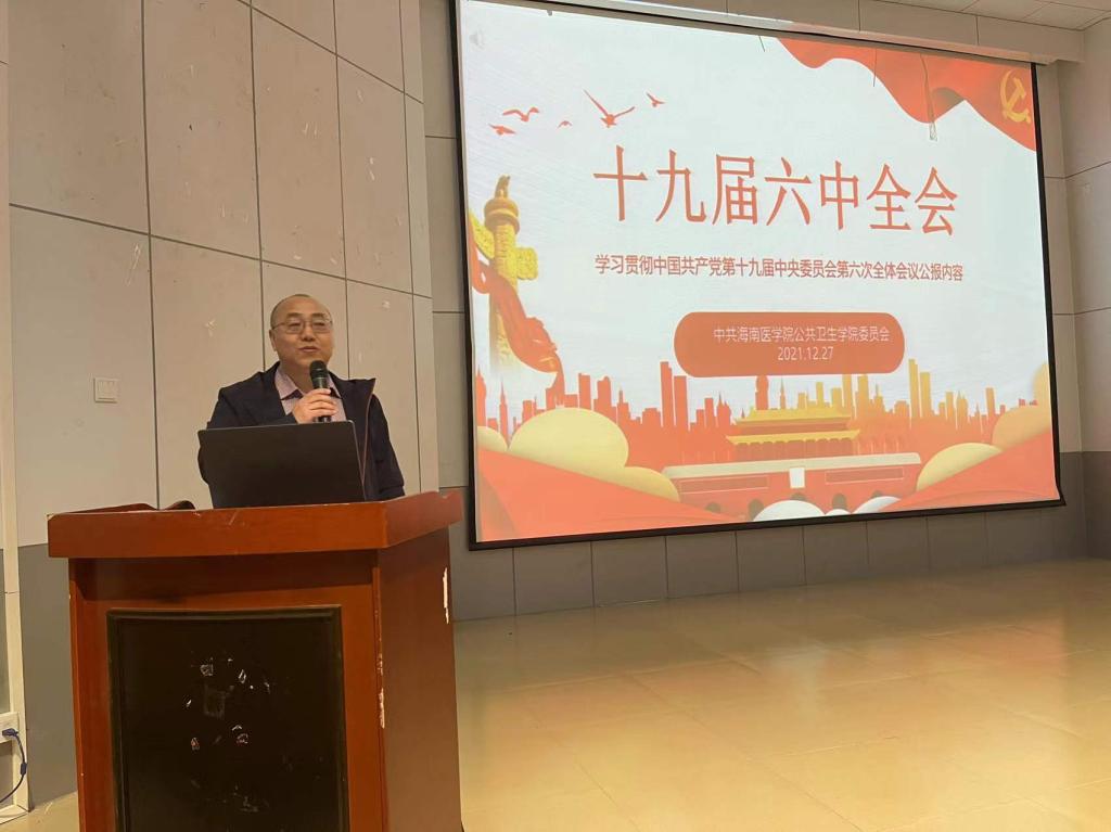 为深入学习贯彻党的十九届六中全会精神,深刻领会和全面把握全会的精神实质和内涵,公共卫生学院党委邀请马克思主义学院的邵娜娜博士于2021年12月27日下午在多功能报告厅对党的十九届六中全会精神进行专题宣讲辅导,目的是教育引导学院的广大师生进一步学深悟透全会精神,切实做到入脑入心、真学真信。参加本次宣讲会的人员有公共卫生学院院长宁毅教授,副院长刘云儒教授,学院的老师和部分学生,共计200余人。会议由党委委员、副院长刘云儒同志主持。