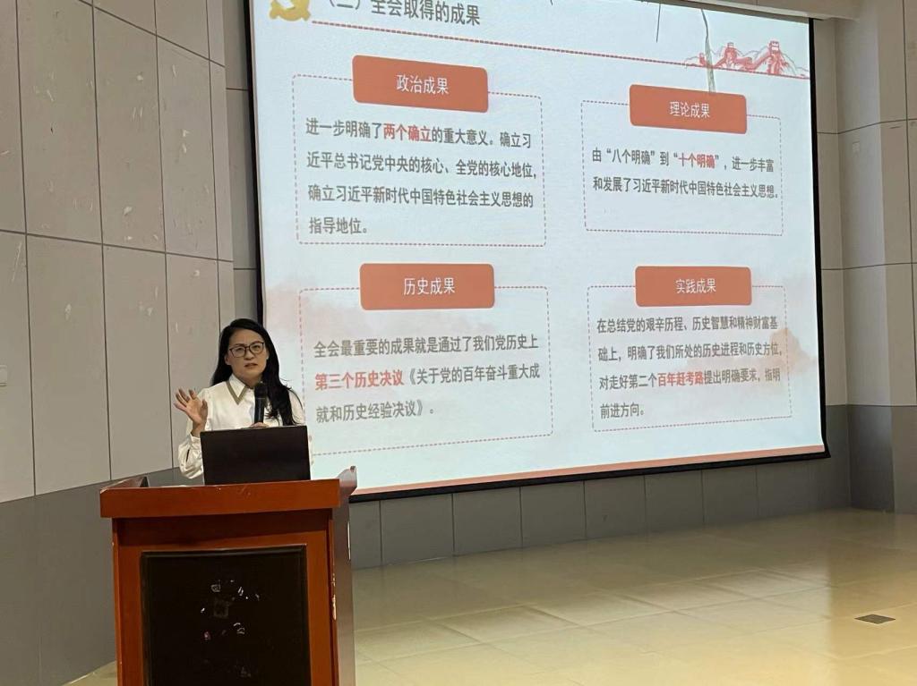 邵娜娜博士以“百年征程波澜壮阔,千秋伟业再启新程”为主题,从“十九届六中全会的重大意义”、“十九届六中全会决议的基本精神”,“贯彻落实好十九届六中全会精神”三个方面进行了深入的分析和讲解。中国共产党第十九届中央委员会第六次全体会议于2021年11月8日至11日在北京举行。会议审议通过了《中共中央关于党的百年奋斗重大成就和历史经验的决议》。此次大会是一个历史性和全局性的重大会议,也是一个具有开创性和里程碑意义的重大会议。全会以对历史的回望、对实践的思考、对规律的把握,引领全党全国各族人民更好地踏上新的征程,为实现第二个百年目标而努力奋斗,具有重大的现实意义和深远的历史意义。