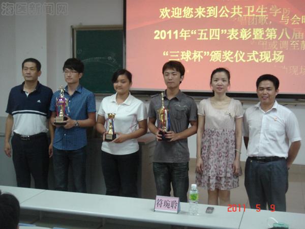 ,公共卫生学院在2-302举办2011年“五四”表彰大会暨第八届“三球杯”竞赛颁奖仪式。学校团委书记符琬聆、公共卫生学院党总支书记岑桑、团委书记王基鸿等出席会议。
