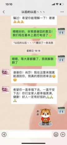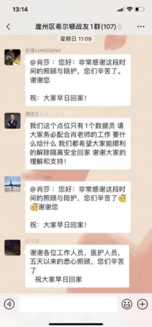 一名结束隔离即将回家的人员给肖莎发来信息:谢谢你,肖莎!我来这里隔离能遇到你,真的感到很幸运。也希望你一直幸福下去,一直平安下去!祝你们全家都幸福美满,健康!好人一定有好报的。