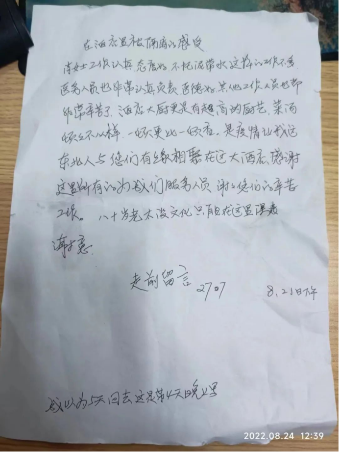 一位80多岁的老人临走时,给肖莎留下了一封信:肖女士工作认真,态度好,不拖泥带水……是疫情让我们有缘相聚在这大酒店,感谢这里所有为我们服务的人员,谢谢你们的辛苦工作。