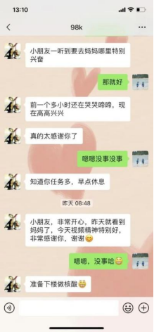 每一位得到志愿者帮助的隔离人员,最终都对志愿者们充满了感激之情,他们深深理解并支持志愿者的工作,甚至被志愿者的热情和奉献所感动,协助志愿者做好其他隔离者的安抚工作,给了志愿者们以最大的宽慰和鼓舞。