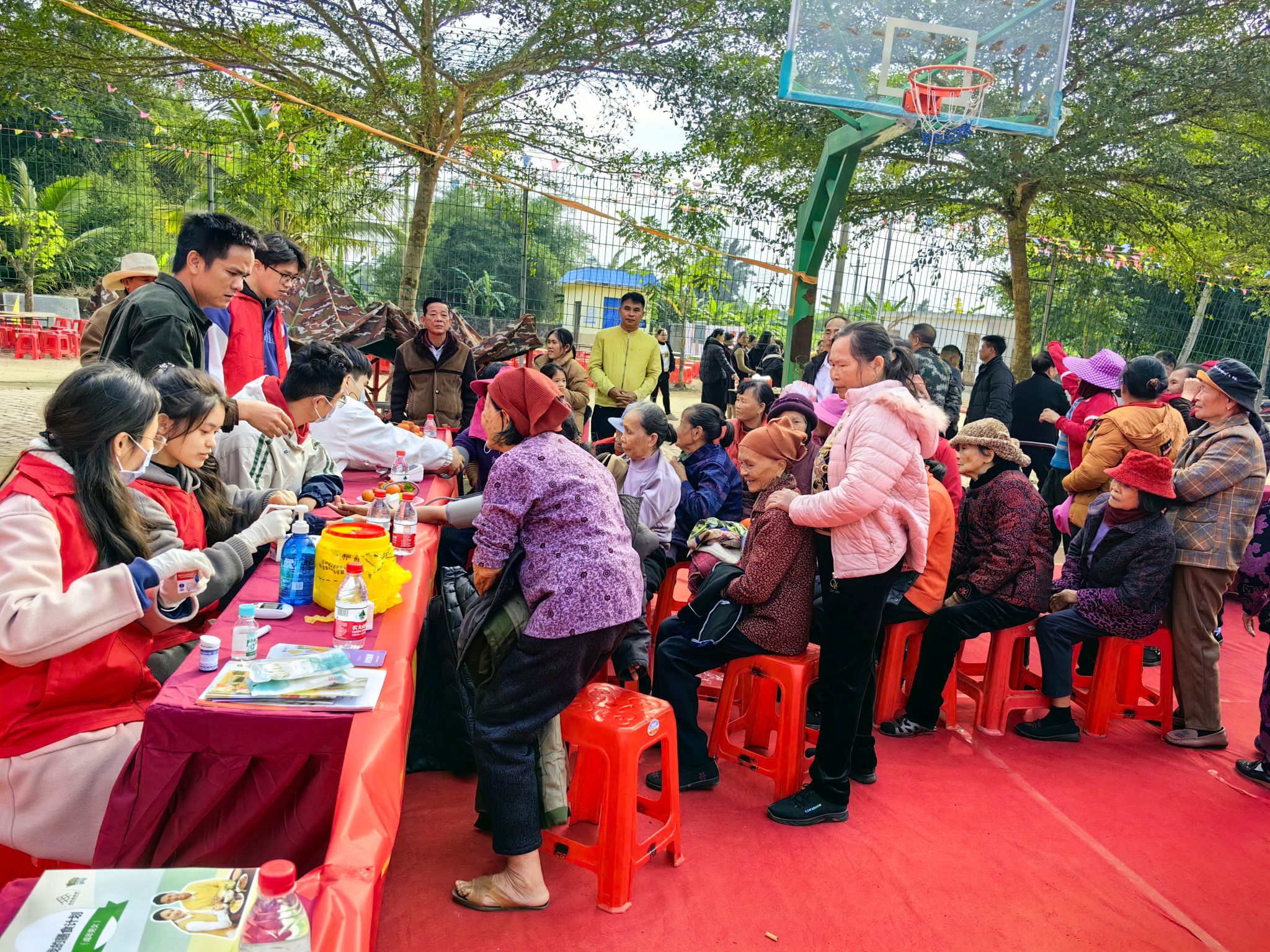 在活动中,师生党员分为两组,一组在长荣村新建的健康广场为村民们测血压、血糖,并与省疾控专家一起开展营养咨询活动;另一组在长荣村委会为当地的村干部、村民开展心肺复苏培训,学生党员详细讲解了心肺复苏的步骤及操作要点,进行现场演示,并让村干部们在模拟人上进行演练。活动后,师生党员与省疾控中心的同志们一起参加长荣村健康广场落成仪式。