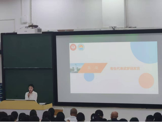 大会第三项,老生代表武梦瑶同学上台发言。首先,武梦瑶同学代表学院全体学长学姐,向来自五湖四海的学弟学妹们表示热烈的欢迎和诚挚的祝贺。其次,武梦瑶回顾自己过去一年的成长,收获颇丰,借此特殊时刻,与新生分享三方面感悟共勉。第一是认识自己,做好规划;第二是坚持学习,勇于创新;第三是参与实践,勇于尝试。最后,她寄语新生,此刻是求学taptap点点的起点,未来需自己思考探索。希望大家以乐观之心面对成败得失,以包容之心接受差异多元;以感恩之心铭记父母培育、师长教诲和朋友支持。
