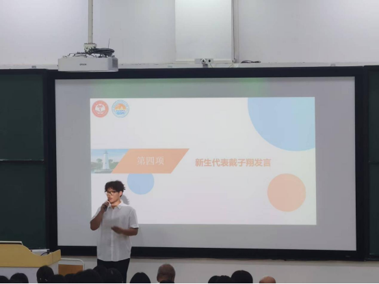 大会第四项,新生代表戴子翔同学上台发言。首先,他表达了对大学生活的憧憬与期待,感谢学院领导、老师和学长学姐们的帮助。其次,他表示,虽然学医之路充满挑战,但大家肩负着守护健康、服务社会的使命,会在老师的指导下,努力学好专业知识,成长为有温度、有责任心、有担当的公卫人,还以苏轼在琼崖的豁达为例,鼓励大家以乐观、豁达的心态面对大学生活和未来的公共卫生事业。最后,他鼓励同学们成为领航员,不断地锤炼、约束、激励、勉励自我,让新生们对大学生活有了更清晰的憧憬。