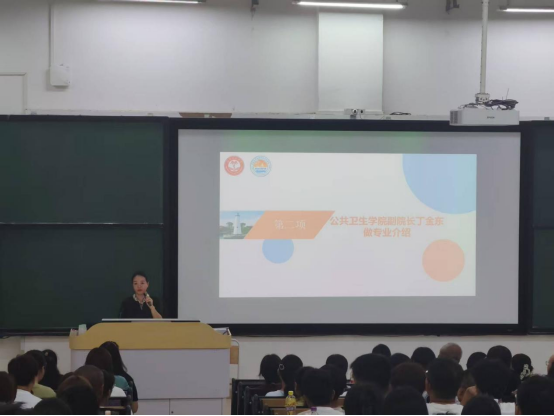 大会第二项,副院长丁金东教授进行了细致入微的专业介绍。首先,她介绍了学院发展历程,从预防医学系成立,到公共卫生学院后续在专业建设、学位点申报等方面的重要节点,以及未来打造本-硕-博一体化人才培养体系、输送国际化人才的规划。接着,她阐述了专业与招生情况,包括现有本科专业、本科招生数,还有研究生规模及涉及的专业方向等。随后,她介绍了学院师资力量,如教职工、专任教师数量,正副高职称、博硕导人数及教师博士占比,以及教学平台和学生总规模。最后是对新生的寄语,希望新生志存高远、融入国家发展,珍惜大学时光、努力学习,在健康中国量。