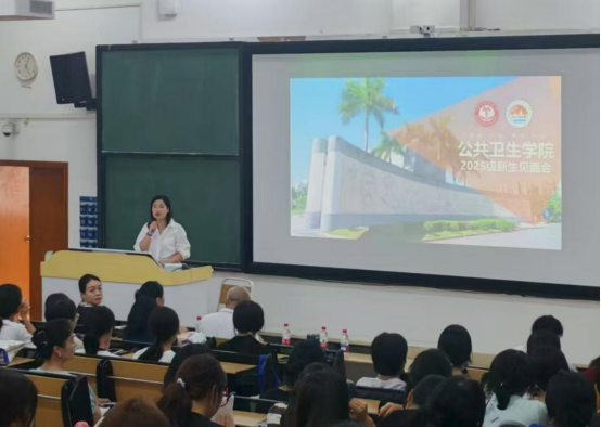 刘媛老师代表学院全体师生向来自全国各地的新生表示热烈欢迎,她强调公共卫生事业是守护人民健康的基石,新生们的选择是对这份使命的庄严回应,未来大家将在这里学习专业知识,肩负“健康中国”的时代重任。