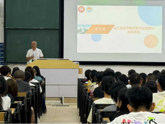 大会第五项,学院党委书记王明兴发表总结讲话。首先他以自身入学经历引发新生共鸣。其次,他指出大学生活并非轻松悠闲,尤其对于医学生而言,它更是一个丰富和深造自我的过程,他认为大学更像自助餐厅,收获取决于自身选择与努力,他建议新生在大学“品尝”好专业知识、社交能力、独立生活、身心健康、社会责任这几道“菜肴”,鼓励大家不要有太大压力,同时也不要盲目跟风,希望大家在大学中找到热爱并全力追求,四年后能在毕业典礼上兑现入学初衷。