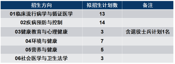 招生方向:下设临床流行病学与循证医学、疾病预防与控制、健康教育与心理健康、环境与健康、营养与健康、社会医学与卫生法学6个方向。