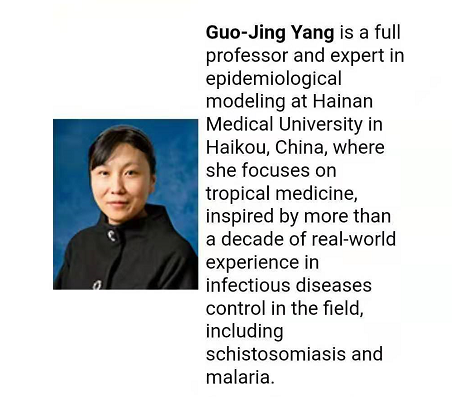 杨国静教授2006年毕业于瑞士热带病与公共卫生研究所(Swiss TPH)并获得博士学位,方向为热带病流行病学。2006-2008年在澳大利亚进行了两年博士后研究,丰富了蚊子种群动态流行病学的建模经验。其在中国及海外从事热带病防控工作尤其是血吸虫病和疟疾防控超过20年,积累了大量现场工作经验。2020年11月,杨国静教授辞去瑞士热带病与公共卫生研究所高级研究员职务,加盟海南医学院,继续从事热带病科研工作。