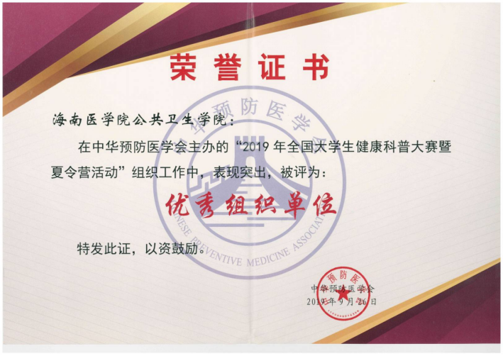 经过主办方初审、网络投票和专家评审等环节,我院推送的上述作品均获得“优秀奖”,海南医学院公共卫生学院因表现积极、组织有力荣获“优秀组织单位”。此次参赛,不仅激发了我院师生参与健康传播社会实践的热情,还提高了学生的健康传播与科学创新能力,对推进理论与实践相结合的教学起到了积极作用,也体现了公卫人义不容辞承担起科普宣传重任的使命与担当。