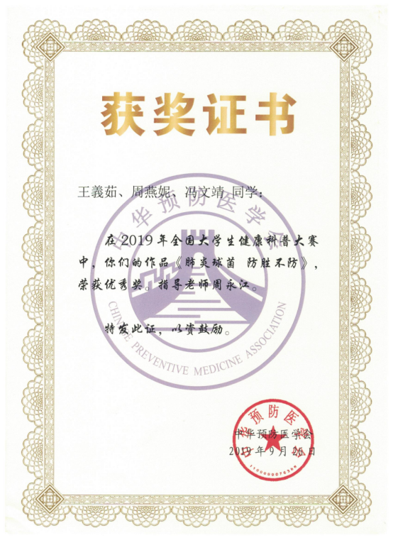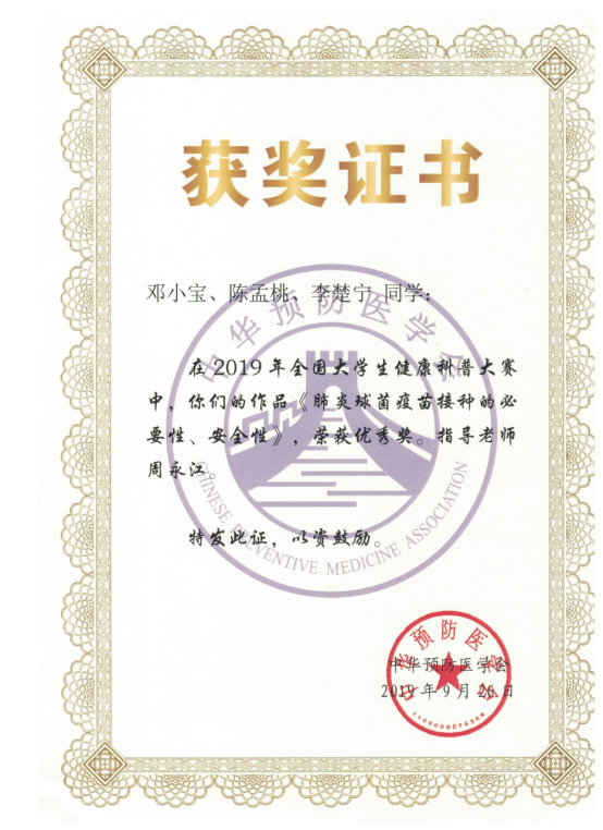 近日,2019年全国大学生健康科普大赛正式落下帷幕,我院两件参赛作品获得“优秀奖”,海南医学院公共卫生学院因表现突出获评“优秀组织单位”。该活动由中华预防医学会、中国疾病预防控制中心研究生院主办,面向全国各大医学院校征集以“肺炎球菌感染防控”为主题创作的健康科普作品,旨在促进大学生参与健康科学传播社会实践活动,提高大学生健康科学创新与传播普及能力。