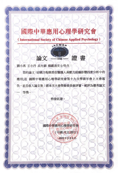 2023年8月4日至7日,由国际中华应用心理学研究会、《中国健康心理学杂志》社主办,华北理工大学心理与精神卫生学院协办的国际中华应用心理学研究会(International Society of Chinese Applied Psychology,ISCAP)第19次学术年会在河北召开。我院王小丹教授指导的2022级硕士研究生刘小燕的论文《结构方程模型在医护人员压力成瘾影响因素分析中的应用》得到评委专家一致认可,在此次学术年会中获得“优秀论文一等奖”。