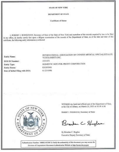 国际中华应用心理学研究会是国际华人医学心理学家联合会(IACMSP)的二级学会组织,旨在团结世界各国华人华裔心理学工作者,促进应用心理学与世界各国的交流、合作、发展。国际华人医学心理学家联合会于1998年在美国纽约州州政府登记,2023年3月23日获得美国纽约州州政府签发的良好信誉证书,证明其开展工作合法,信誉良好。
