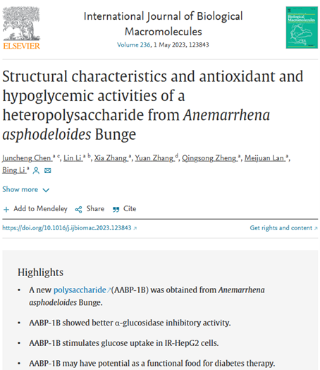 日前,海南医学院公共卫生与全健康国际学院陈君诚博士以第一作者名义在《International Journal of Biological Macromolecules》杂志上(中国科学院一区TOP,IF 8.02),发表了关于知母多糖降血糖机制的文章(Structural characteristics and antioxidant and hypoglycemic activities of a heteropolysaccharide from Anemarrhena asphodeloides Bunge),揭示了知母多糖控制血糖的机制。