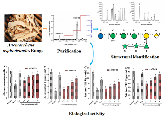 陈君诚博士团队从知母中纯化出一种酸性均一多糖 (AABP-1B)。AABP-1B由甘露糖、鼠李糖、半乳糖醛酸、葡萄糖、半乳糖和阿拉伯糖组成,其摩尔比为6.3:1.3:1.1:0.2:0.4:0.7,分子量为105 KDa。 基于甲基化和 NMR 分析,AABP-1B 主要由 4)-β-D-Manp-(1 和 4)-2-O-acetyl-β-D-Manp-(1糖苷键组成的主链。生物活性研究表明,知母多糖不仅具有良好的抗氧化活性,而且还表现出对α-葡萄糖苷酶抑制作用。此外,知母多糖(AABP-1B)能增强胰岛素抵抗HepG2细胞中葡萄糖消耗和糖原合成。这些结果表明知母多糖具有一定的降血糖活性,未来可以作为降糖药或功能性食品的重要原料之一。