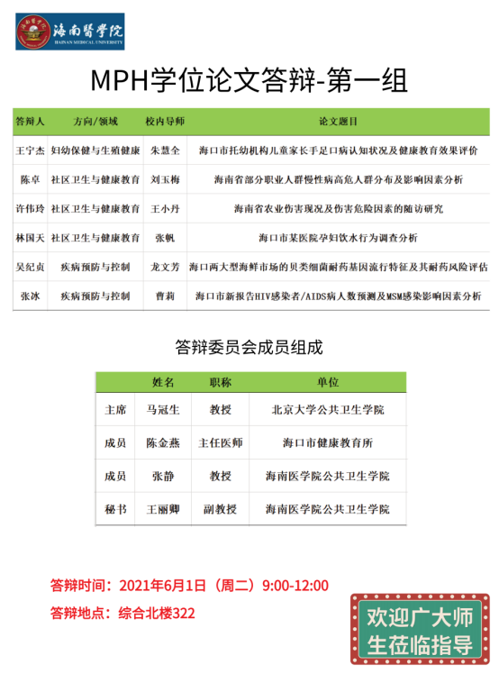 2021年6月1日,我院举办了2021届公共卫生专业硕士学位论文答辩会。我院高度重视此次答辩会,特别邀请了北京大学公共卫生学院马冠生教授、南华大学公共卫生学院杨飞教授、海南省人民医院黄仕雄教授、海南省师范大学袁晓琳副教授、海口市健康教育所陈金燕主任医师和海南医学院公共卫生学院张静教授出任答辩委员,邀请马冠生教授和杨飞教授两位省外专家担任答辩委员会组长。我院硕士研究生导师、各级研究生共40余人参会。