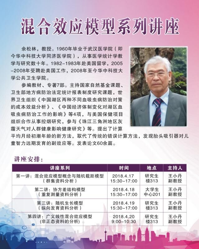 余松林,教授。1960年毕业于武汉医学院(即今华中科技大学同济医学院),从事医学统计学教学与研究数十年。1982-1983年赴美国留学,2005-2008年受聘赴美国工作,2008年至今华中科技大学公共卫生学院。