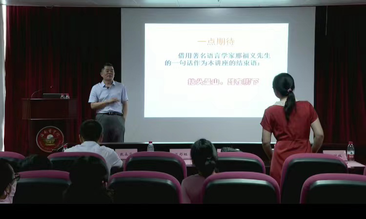 温锁林教授从五个方面为老师们讲解了人文社科类论文写作的方法,并以语言学本体语法研究为切入点阐述了语言教学的特点与方法。温教授语言诙谐幽默,深入浅出,例证生动形象,易于理解。讲座现场气氛热烈,互动积极,取得了良好的效果。在讲座最后,温教授用著名语言学家刑福义先生的一句话“抬头是山,路在脚下”勉励参会教师,希望教师们在教学与科研的道路上不畏艰难、脚踏实地、勇攀高峰。