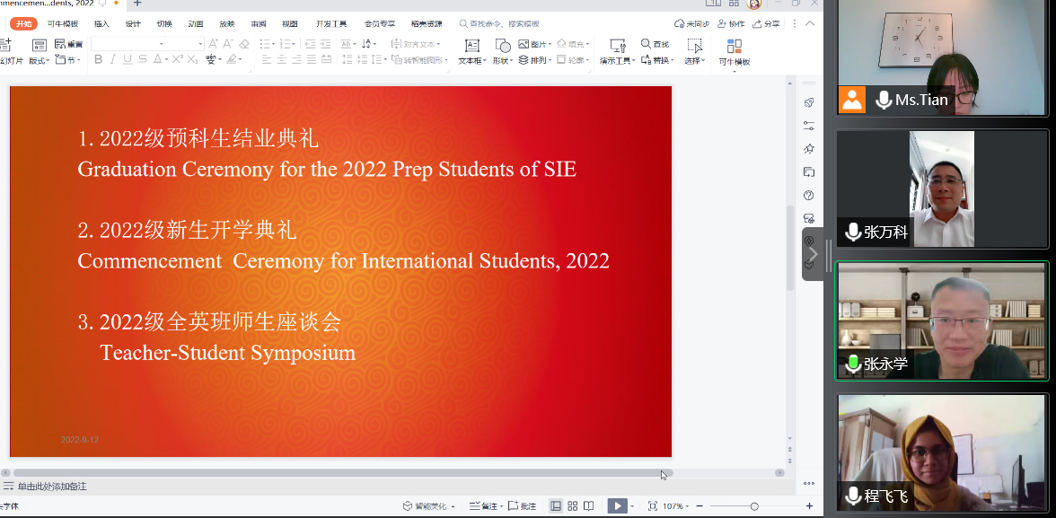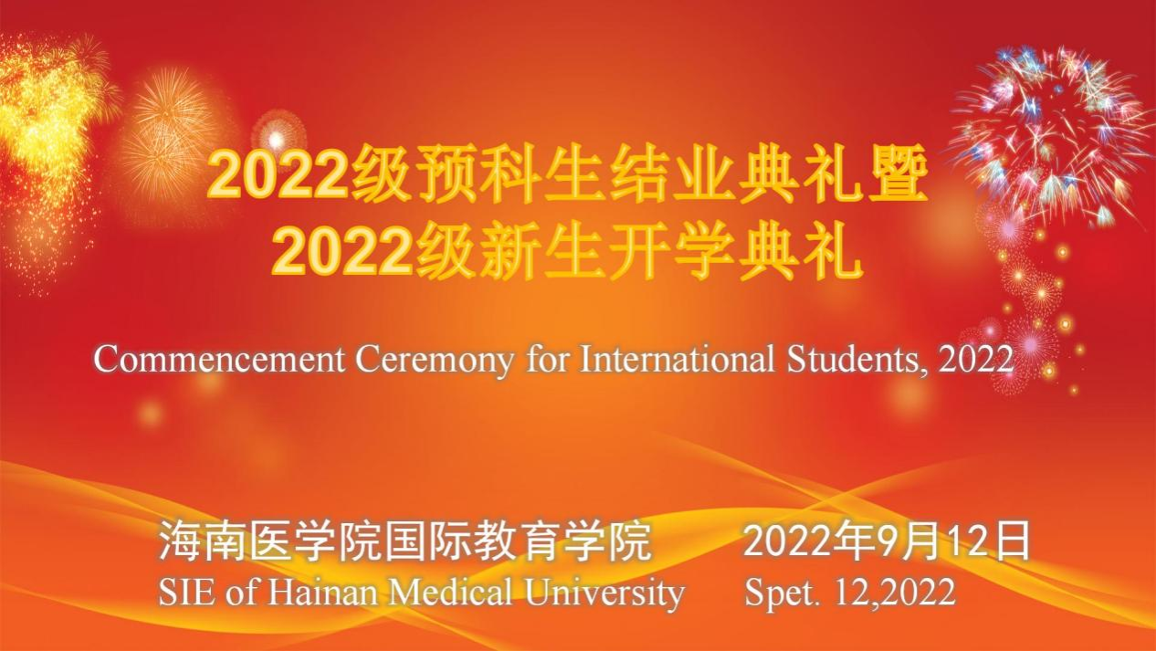 2022年9月12日,海南医学院国际教育学院2022级国际学生汉语预科班结业典礼暨2022级本科生开学典礼线上举行。学生工作处熊燏处长、国际教育学院张万科书记、张永学院长、颜时姣副院长、杨文君副院长出席典礼并发言,国际教育学院全体教师参加此次典礼。