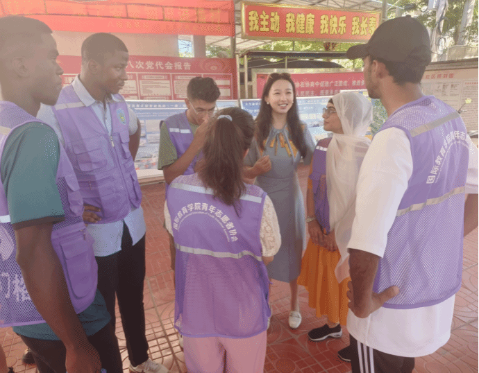 接下来,王嘉豪同学用通俗易懂的语言向扶室社区的居民们讲解了心肺复苏、气道异物梗阻及AED等急救知识,吴正豪、荣乐(加纳)、刘畅(巴基斯坦)、柳岑晓四位同学在现场示范心肺复苏术、气道异物梗阻急救等实用救护技术。