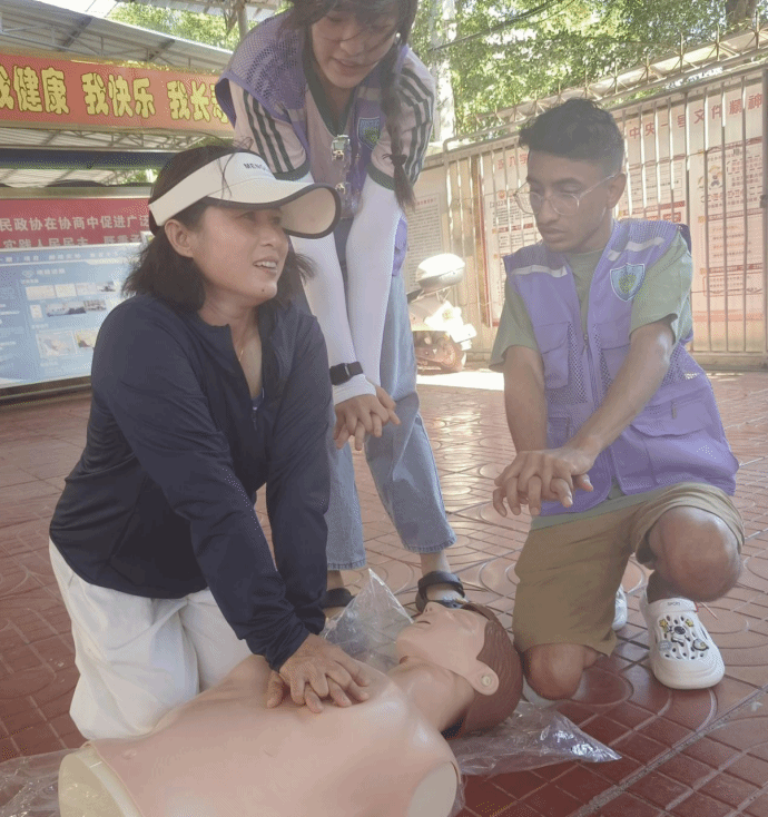 中外学生们“手把手”的实操展示,让居民们对心肺复苏的实施有了更深入的理解。专业的讲解,熟练的手法激发不少人的热情。大家纷纷上前练习,学习安全救护本领,防患于未然,以备不时之需。通过观摩与学习,在场居民很快熟悉和掌握了心肺复苏的操作流程和技巧。