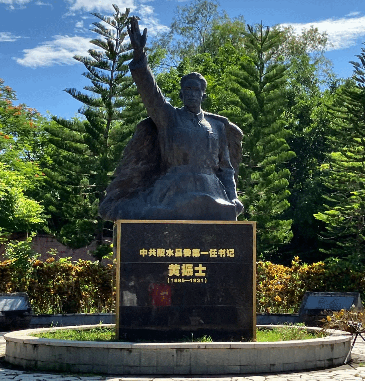 黄振士(1895—1931),原名黄福生,男,黎族,陵水县文罗镇坡村人。1926年,黄振士回到家乡陵水开展革命工作,琼崖四二二事变后,黄振士率领陵水党的领导机关和农军一直驻扎在坡村,组织开展工农武装割据斗争。此后,以坡村为中心的红色区域开始逐步建立和发展。从陵水县党小组组长到中共陵水县委首任书记,从陵水县人民政府委员到琼崖讨逆革命军第八路军党代表,从中共琼崖特委委员到中共琼崖特委经济委员会副主任……短短的36年生命中,黄振士领导多次战斗、先后在党政军机关担任不同职位,始终奋斗在琼崖革命的战斗第一线,为民族的解放、为无产阶级革命事业的胜利而奋斗。
