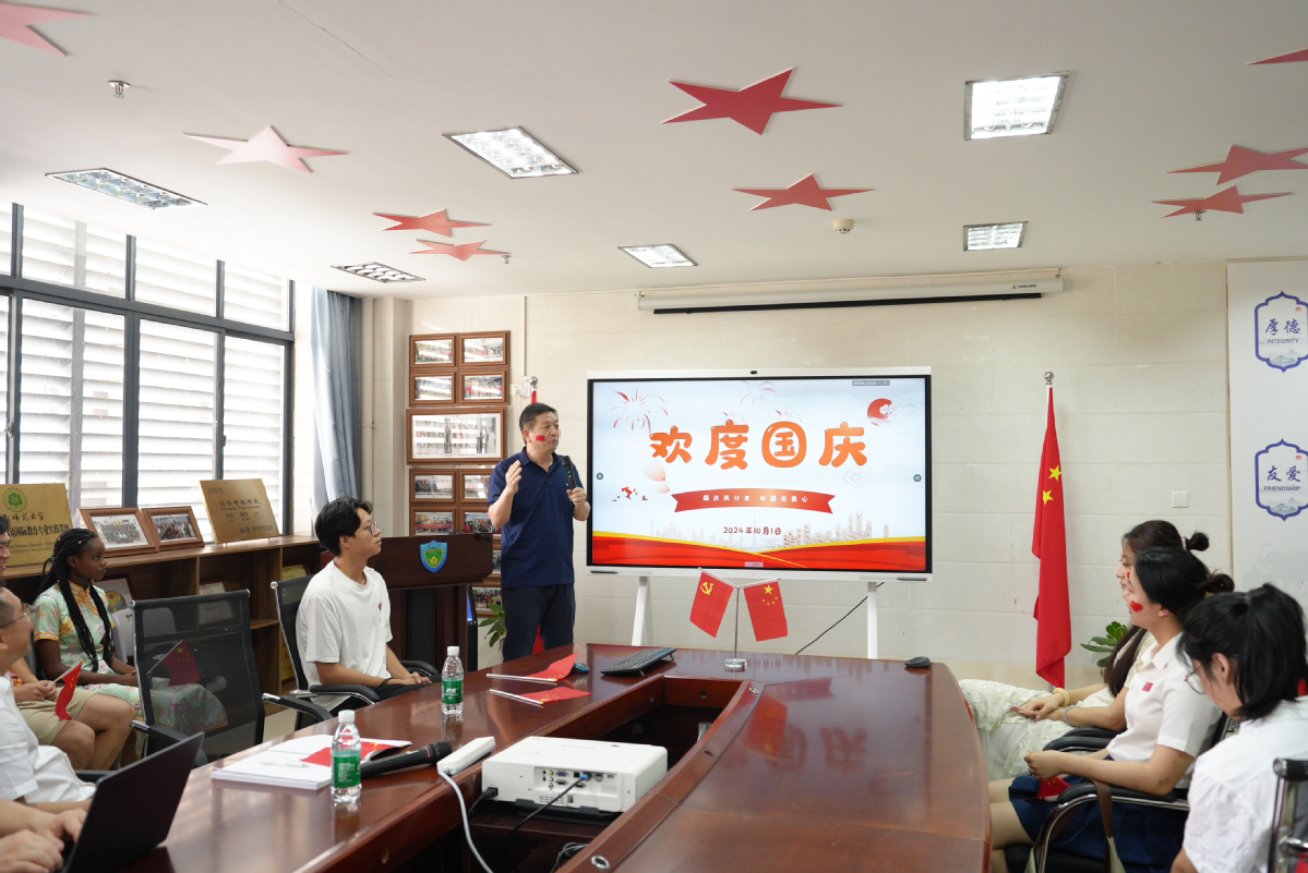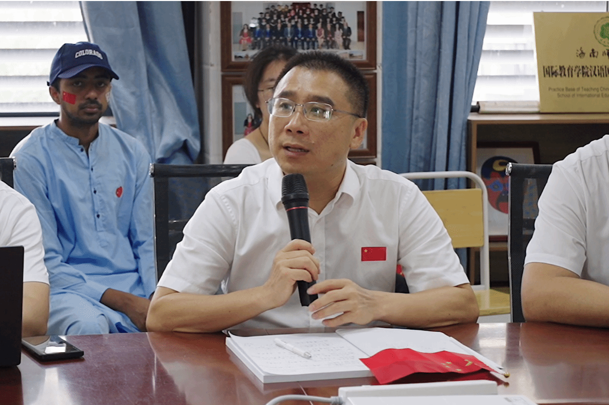 马克思主义学院黎同柏教授分享了他的所思所感。他讲到,在中国的传统文化中历来重视生日,新中国成立75周年对中国人民和中华民族而言,更是意义非凡。从古代中国,到近代中国,再到现代中国,创造了灿烂辉煌的文明,为世界文明做出了巨大贡献。特别是在改革开放之后,中国迈入快速发展的春天。海南的发展蓬勃向前,特别是在做好教育、科技、人才一体化建设等方面,起到了示范作用。他希望中外学生们紧跟时代发展潮流,以实际青春行动迎接更美好的海南和中国,来华留学生们能多到中国各地走走看看,感受不同地域的风土人情,感受中国人民的生活面貌。