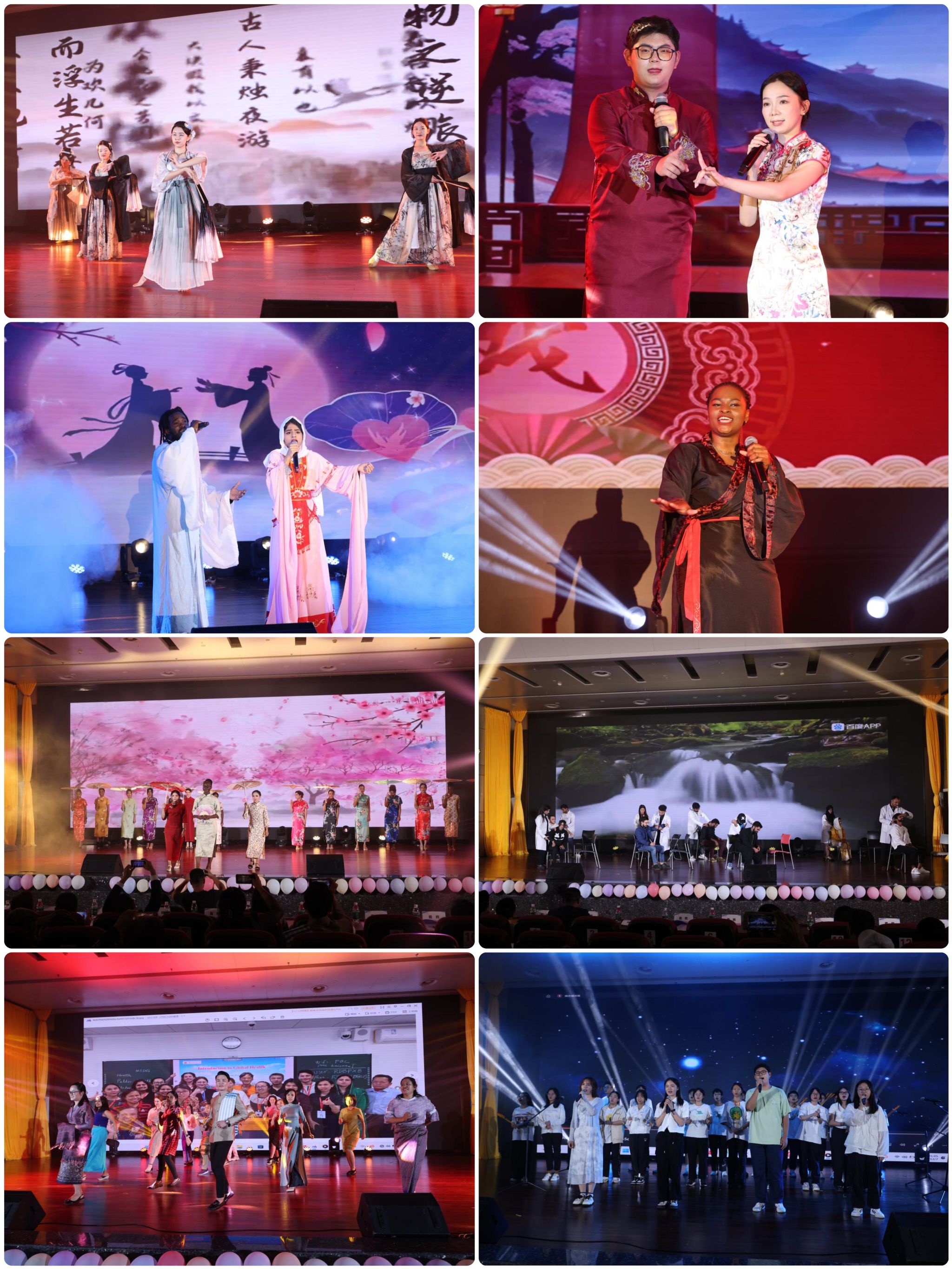 晚会上,丰富多彩的节目逐一上演,欢声笑语此起彼伏。其中,既有活力四射的街舞串烧点燃全场,又有优美动听的中英文歌曲《是妈妈是女儿》《落叶归根》《好一朵美丽的茉莉花》《稻香》《Blank Space》《Who Will》等,还有作为中华瑰宝的戏剧串烧《树上鸟儿成双对》《谁说女子不如男》《武家坡》等。舞蹈《兰亭序》展现了华夏风情的旗袍文化秀,古风浓郁;舞蹈《Barth Sa Lob》充满东南亚风情与魅力。还有器乐演奏《童年回忆录》、中医文化体验节目《Wow,这是中医》等节目。精彩的表演让人目不暇接,文化的浸润使人心生向往。