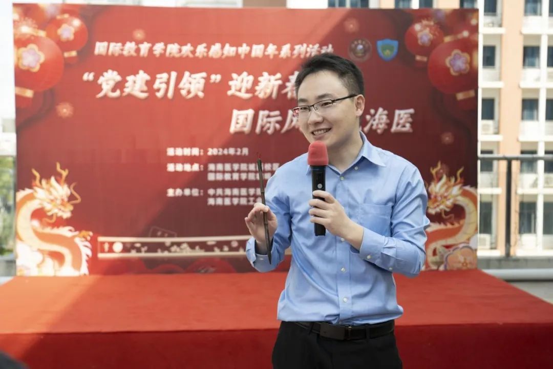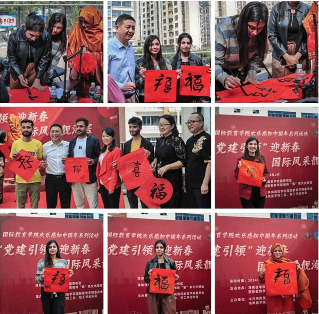 2月3日,“写春联,送福字”新春祝福向未来活动在海南医学院国际教育学院咖啡“语”茶文化驿站暖心举办,标志着欢乐感知中国年系列活动精彩开启。本次活动由国际教育学院联合学校工会、职工书法协会共同主办,海南医学院李现红副校长、国际教育学院张万科书记、马克思主义学院黎同柏副书记、学生工作处王小强副处长、西英格兰学院徐芳芳副书记、姜克银教授、徐海波博士、中国日报乔宗宣记者,以及来自国际教育学院的老师们莅临现场,与六十多名国际学生及教职工子女一起“写春联,送福字”,感知“中国红”,共享春节文化盛宴。