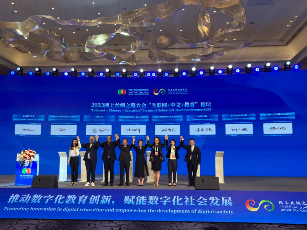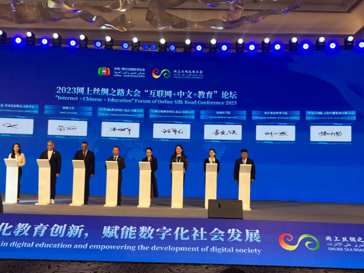 9月22日上午,国际教育学院党委张万科书记与领军人才姜克银教授在宁夏银川参加了第六届中国—阿拉伯国家博览会2023 网上丝绸之路大会框架下的“互联网+中文+教育”论坛。参加本次大会的领导和专家有:宁夏回族自治区党委常委、组织部部长石岱, 阿拉伯国家大学联盟主席、埃及高教部前部长阿姆尔·埃扎特·萨拉马,中国教育部中外语言交流合作中心副主任胡志平,中文联盟主席王锦红等。本次大会聚焦“创新驱动·数引未来”主题,内容精彩纷呈。大会期间,举行了研究成果发布、项目签约和APP上线仪式等活动,为“一带一路”共建国家“互联网+”融合发展提供产业数字化解决方案。在项目签约环节,姜克银教授代表《中国与阿拉伯国家合作故事集》系列研究成果的作者出席海南医学院与阿联酋指南针出版社联合出版作品的签约仪式。