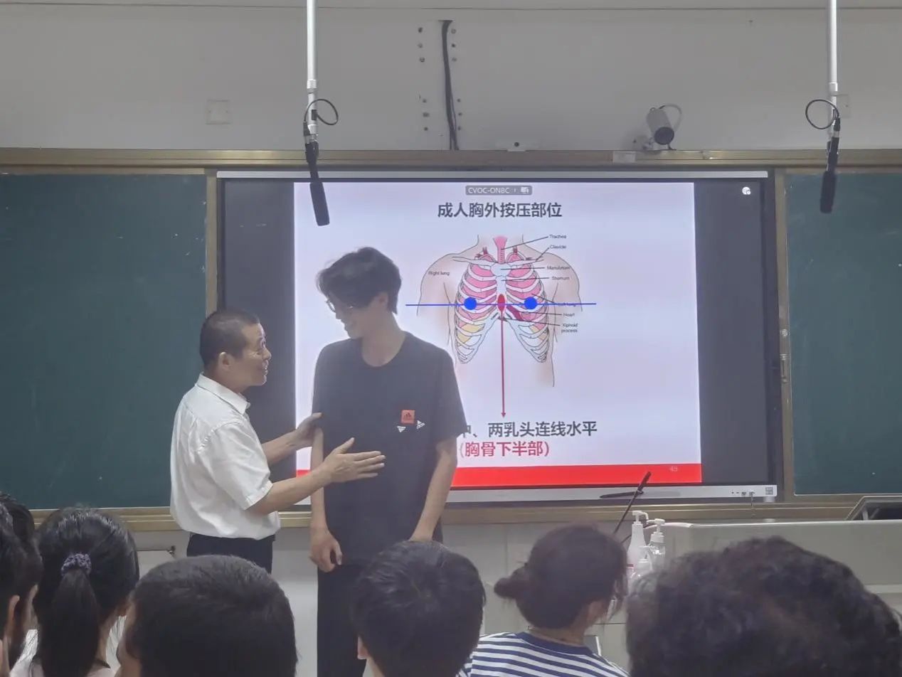 7月3日晚王长福处长在体育馆对同学们进行了实际操作的考核和评估,考察同学们是否在突发紧急状况时可以正确规范应对,对病人及时施救。王长福处长先为同学们示范正确的心肺复苏操作流程,并亲自指导同学们操练,力求做到细节到位,精准救助。