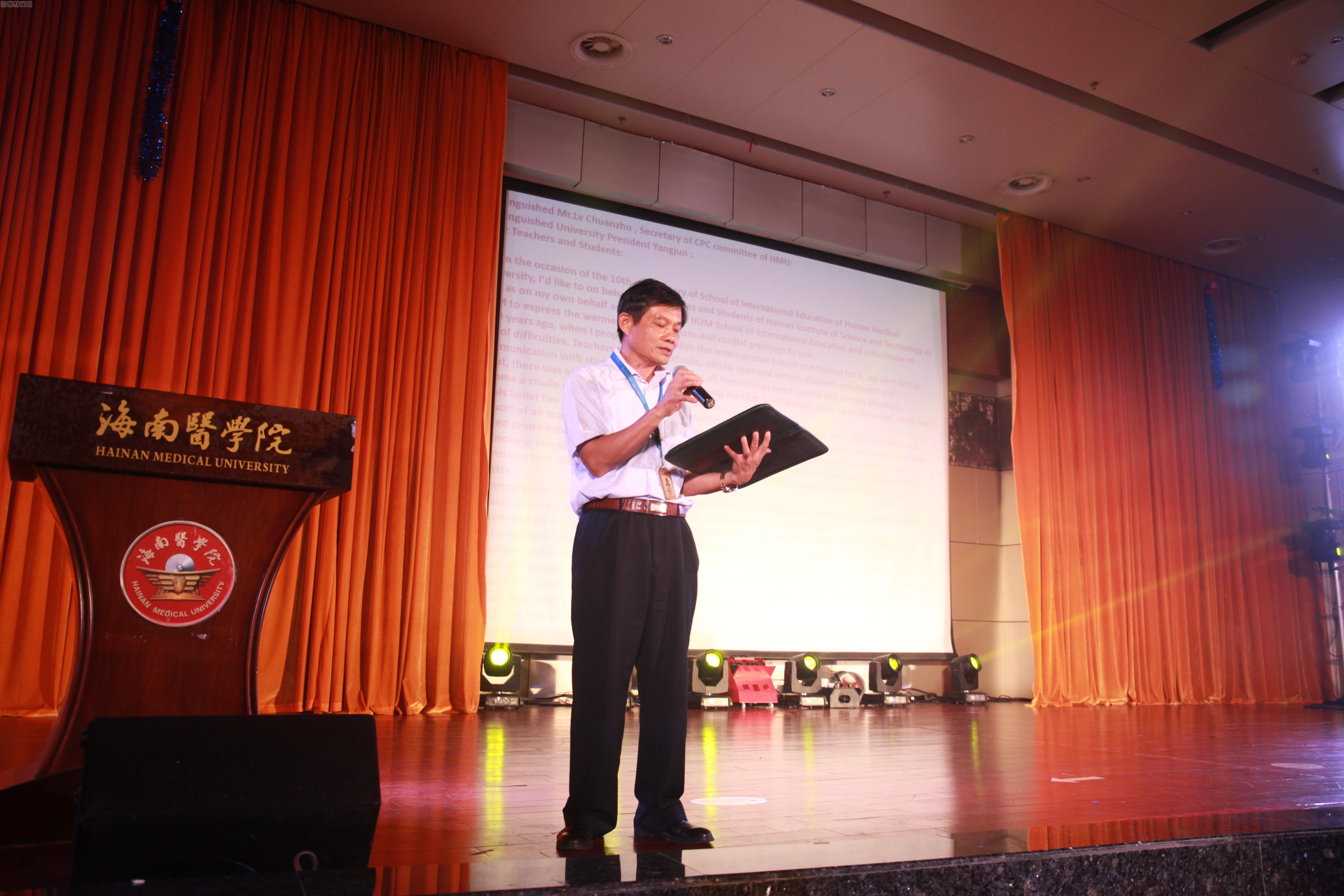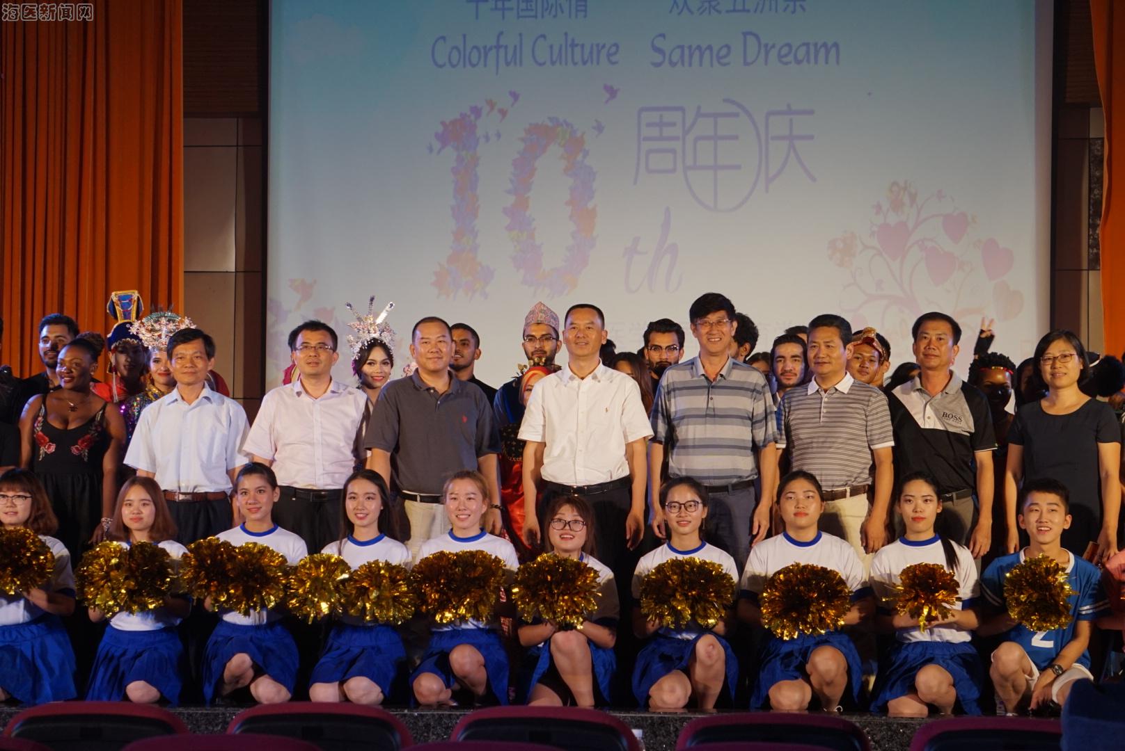 在这热情似火的六月,海南医学院国际教育学院迎来了十周岁的生日。十年发展,风雨兼程。2017年6月11日晚,以“十载国际情 欢聚五洲亲”为主题的海南医学院国际教育学院十周年院庆晚会在国际报告厅成功举行。海南省教育厅高教处朱双平处长、国际合作与交流处张超处长,海南省安全厅张先勤总队长,海口市公安局出入境管理支队陈文支队长,海南师范大学国际教育学院陈江副院长等省市、兄弟院校的领导和嘉宾应邀出席晚会。海南医学院陈志斌副校长、黄元华副校长、校各职能部门领导以及各二级学院领导与学校八百多名中外师生欢聚一堂,共迎国际教育学院建院十周年庆典。