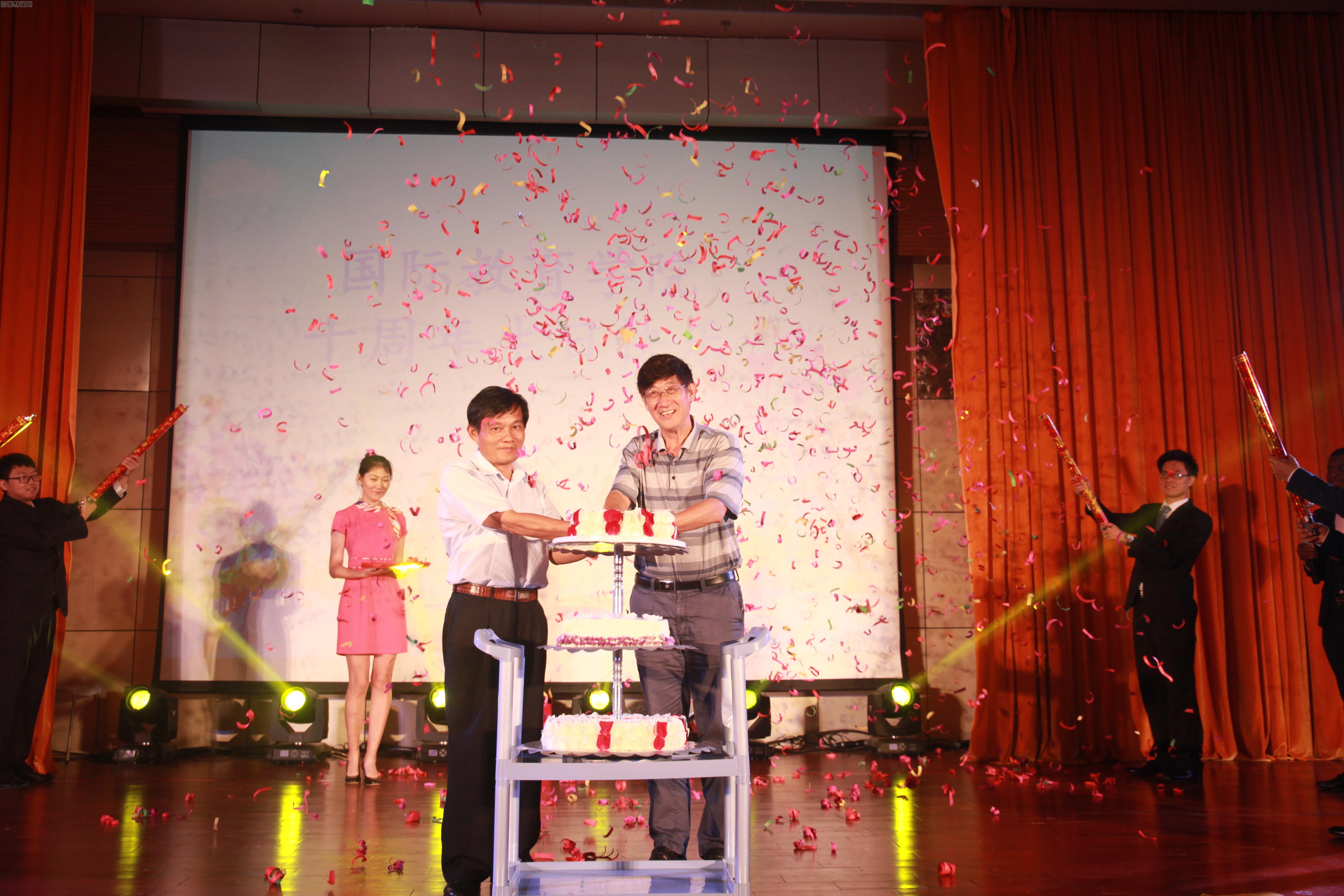 陈志斌副校长和 国教院 王华民院长同切蛋糕为国际教育学院十周年生日献上祝福