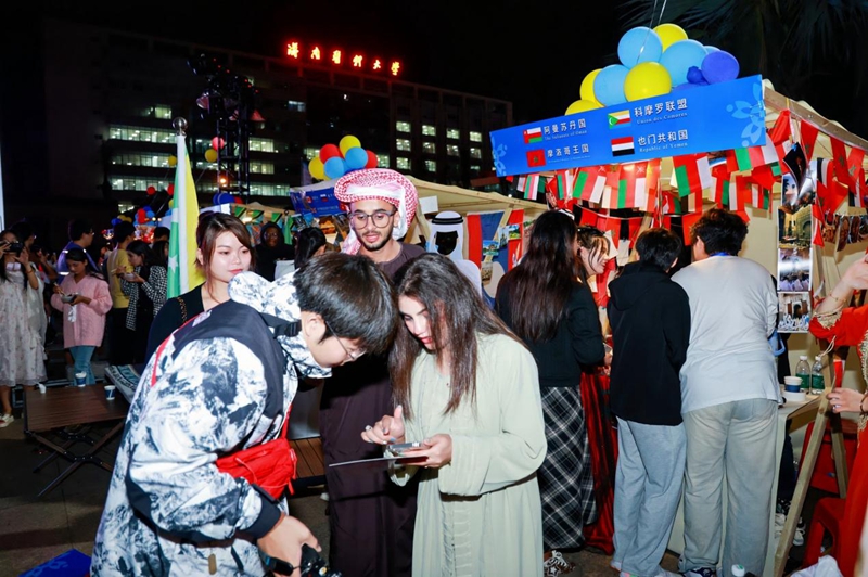 国际文化节开幕式还设置了18个国际展台,共有33个国家的学生参与各国传统服饰、手工艺品、特色美食等的文化展示。黎锦、琼剧、针灸推拿和中国传统器乐等中国传统文化的展位前观者如织。