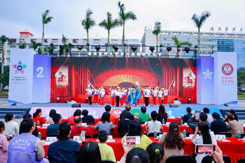 开幕式活动精彩纷呈。海南琼剧基本功展示《琼韵梨园》与中国传统戏剧《变脸》的巧妙结合拉开了活动序幕,来自印度尼西亚、加拿大、加纳、赞比亚等7个国家的留学生与海南省琼剧团的老师共同演绎中国非遗之美,点燃活动现场气氛;融入了丰富国际元素的非洲鼓、印度尼西亚歌舞、尼泊尔舞蹈、阿拉伯歌曲等表演,充分展现了各国文化的独特魅力;中国传统养生功法《八段锦》、传承和弘扬医学精神的朗诵《大医精诚》、海南传统民歌《久久不见久久见》等表演,无不体现文化因交流而多彩,文化因互鉴而丰富的理念。