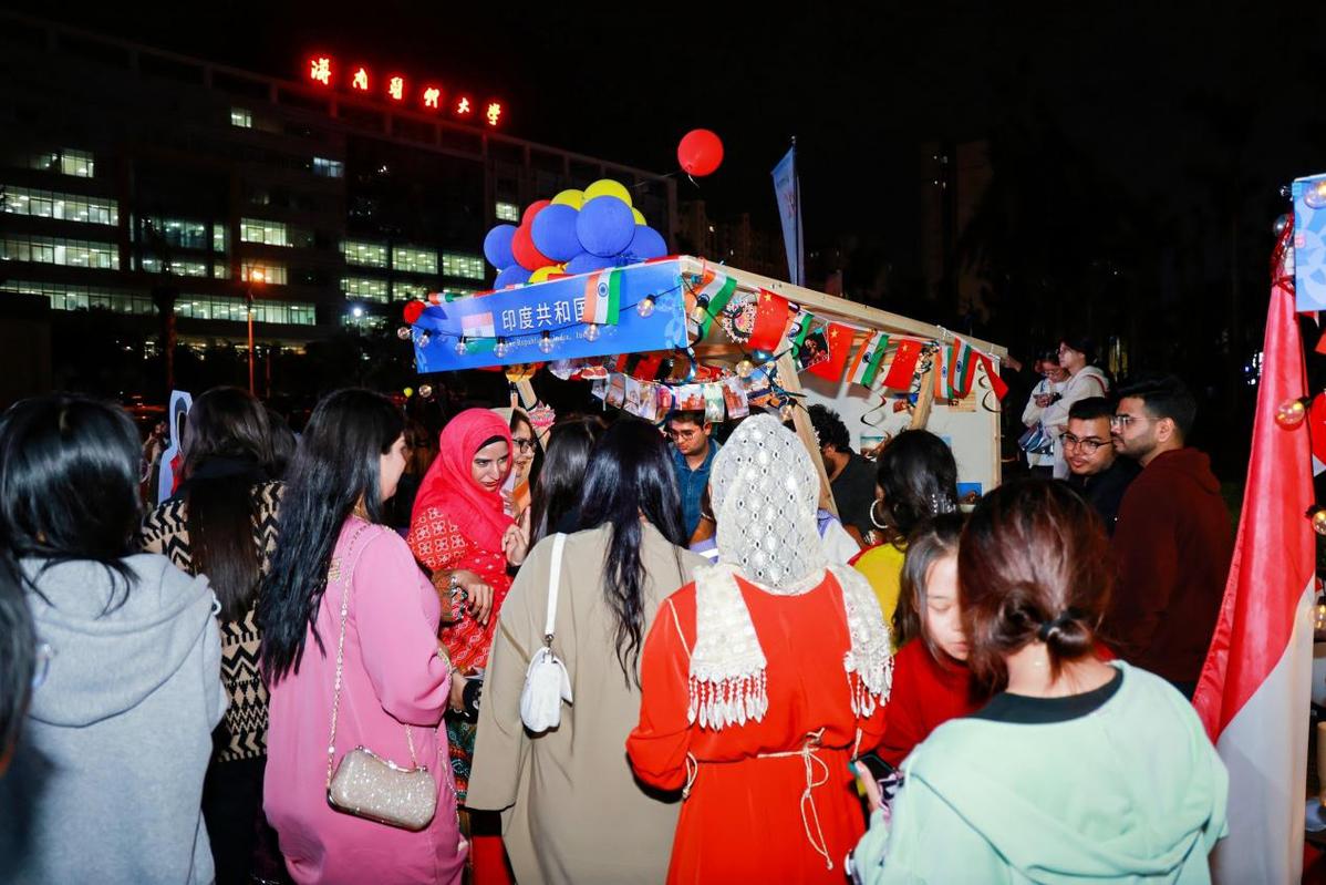 国际文化节开幕式还设置了18个国际展台,33个国家的学生参与各国传统服饰、手工艺品、特色美食等的文化展示。黎锦、琼剧、针灸推拿和中国传统器乐等中国传统文化的展位前观者如市。
