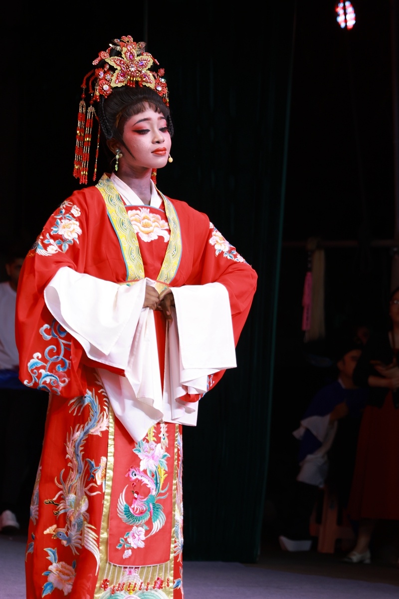 舞台上,灯光柔和,乐声悠扬,中外师生与琼剧艺术家们身着华美的戏服,以精湛细腻的演技,演绎着一段段忠孝节义、廉洁奉公、伉俪情深的故事。舞台上传来的唱腔时而高亢激昂,如海浪拍岸,激荡人心;时而低回婉转,似林间溪流,沁人心脾。现场观众都被这份来自中国传统文化艺术的力量深深震撼,被留学生唱琼剧的形式深深吸引,台上台下所有人共同感受着那份跨越时代的情感共鸣。