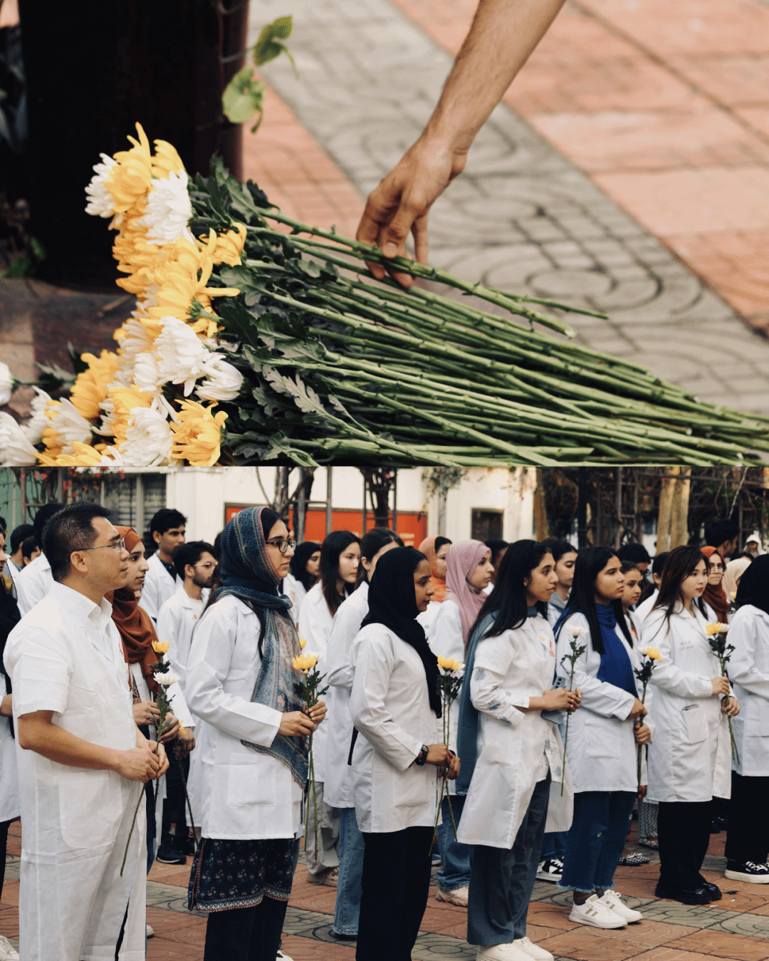 活动在庄严肃穆的氛围中拉开帷幕。全体师生身着白大褂,怀着崇敬与感恩之心,向“无言”良师们默哀一分钟,师生们以沉默的力量表达对他们的深切缅怀和崇高敬意。默哀结束后,师生们依次向“无言”良师们敬献鲜花。每一朵鲜花都承载着师生们的感恩与敬意,象征着对生命的尊重与对医学的热爱。基础医学与生命科学学院教工第一党支部书记劳梅丽老师作为教师代表发言。劳梅丽深情回顾了大体老师们的奉献精神,他们用自己最后的力量,为医学教育搭建了通往知识殿堂的桥梁。“从《希波克拉底誓言》到《日内瓦宣言》,医学伦理的核心始终是对生命的敬畏。这些选择成为‘大体老师’的奉献者,以超越生死的姿态诠释了最高阶的伦理抉择——将肉体凡躯升华为医学文明的基石。”