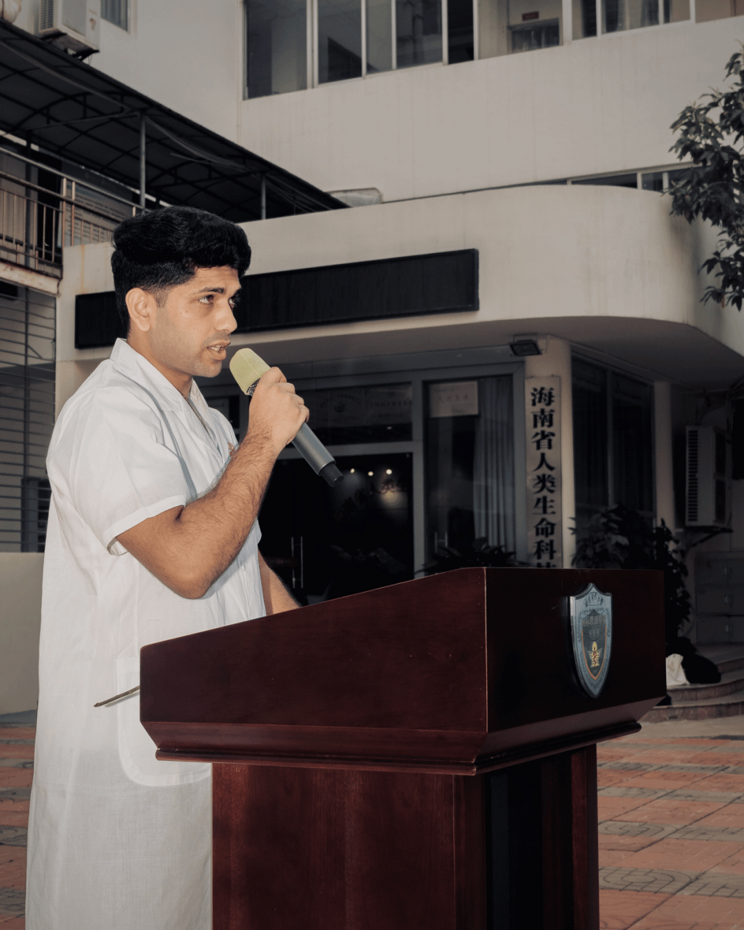 与此同时,巴基斯坦籍国际学生ALI CHAND(周尚智)作为国际医学生代表发言。他表示,“无言”良师们的奉献精神深深感染了每一位医学生。他们虽然沉默无言,却用身体为我们讲述着最生动的解剖学课程。“我们将以‘无言’良师为榜样,努力学习医学知识,提升专业技能,用实际行动诠释医学的真谛,成为一名尊重生命、敬畏生命的优秀医者。”