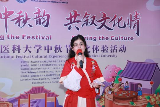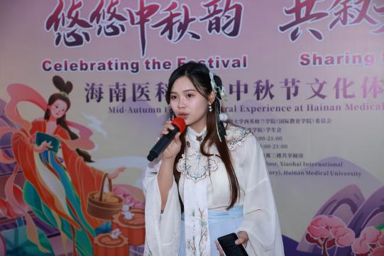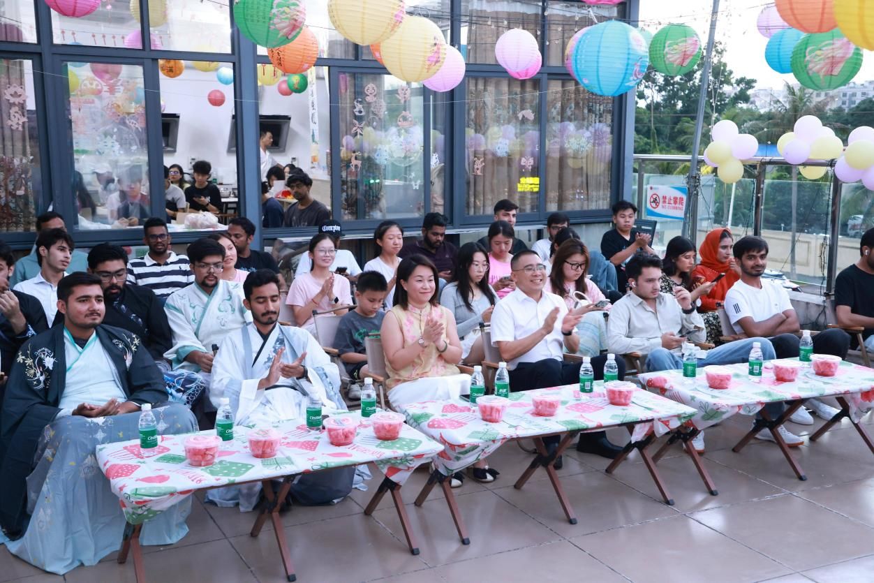 夜幕渐深,皎洁的月光洒在活动现场,中外学子轮番登场,用精彩演出展现多元风采。巴基斯坦留学生AQSA许糖用中文深情演绎歌曲《如愿》;来自印度尼西亚的CECILIA曾小青献唱了一首粤语经典《喜欢你》赢得满场掌声;中国学生李玟洁一曲《借月》,将全场带入静谧而深沉的意境。压轴登场的是汉服社的同学们,她们身着云纹广袖襦裙,月光下翩翩起舞。