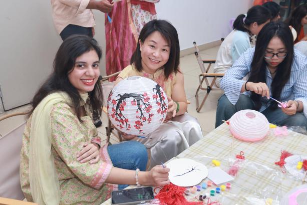 灯笼制作区与兔子灯装饰区同样创意满格。空白灯笼、五彩颜料、丝带贴纸等材料一应俱全,中外学子自发组队,发挥想象勾勒创意。制作完成后,部分精美灯笼被悬挂在活动现场,暖黄的灯光透过纸灯洒下,节日氛围瞬间拉满。
