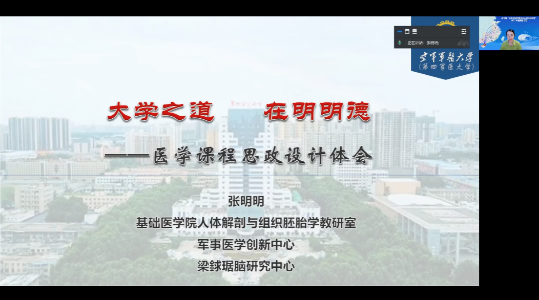 空军军医大学基础医学院人体解剖与组织胚胎学教研室张明明副教授分享了“医学课程思政设计体会”,指出“没有不带观点的教学、教师一言一行皆为思政”,她通过案例为大家生动讲述“医学课程思政25法”,对虚拟教研室课程思政建设具有积极的启发意义。