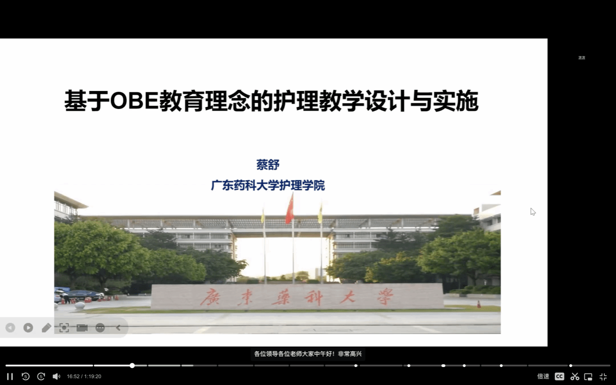 会议的第一部分由广东药科大学蔡舒副院长做“基于OBE理念的护理学人才培养模式探索”的主题汇报,首先强调了课程系统性、整合性不够,需要与医院进行资源共享。接着阐述了基于国家和社会对护理专业的需求进行课程目标、教学内容、教学评价的设计。最后强调OBE教育应将人群健康需求与行业胜任力联系起来。旨在进一步深化护理专业教学改革,促进护生临床思维能力提升,提高护理专业人才培养质量。