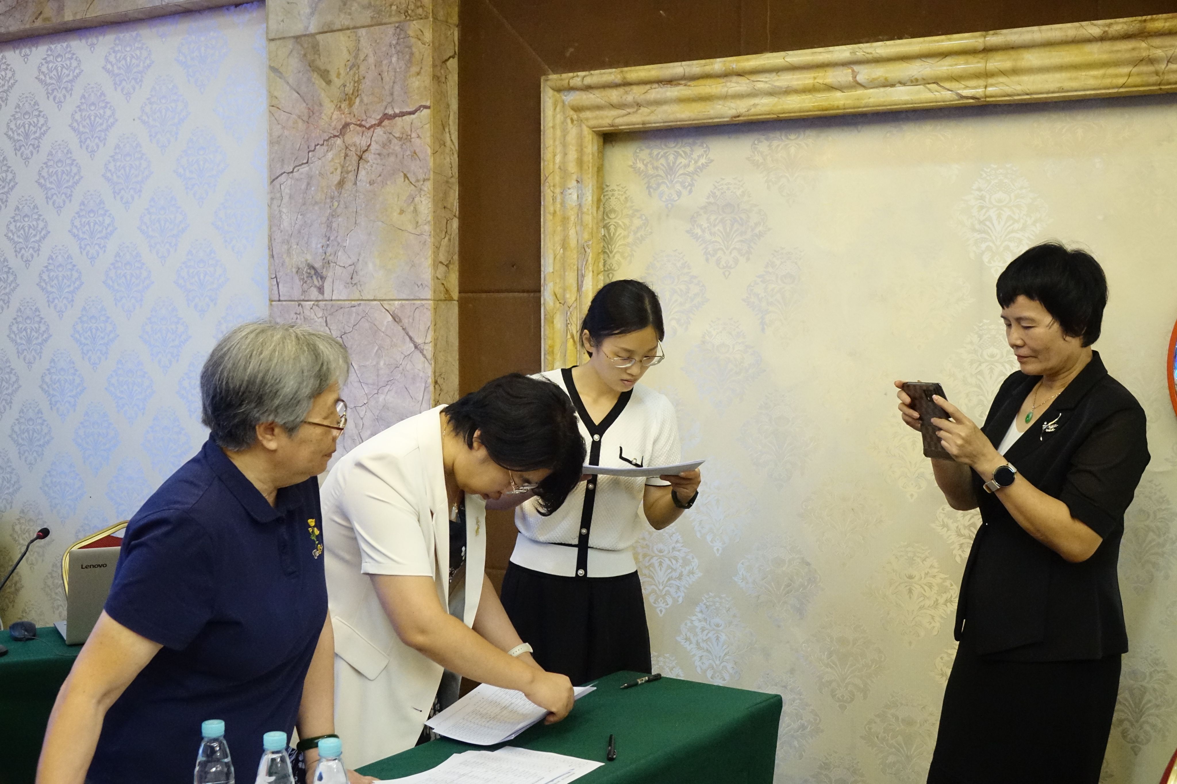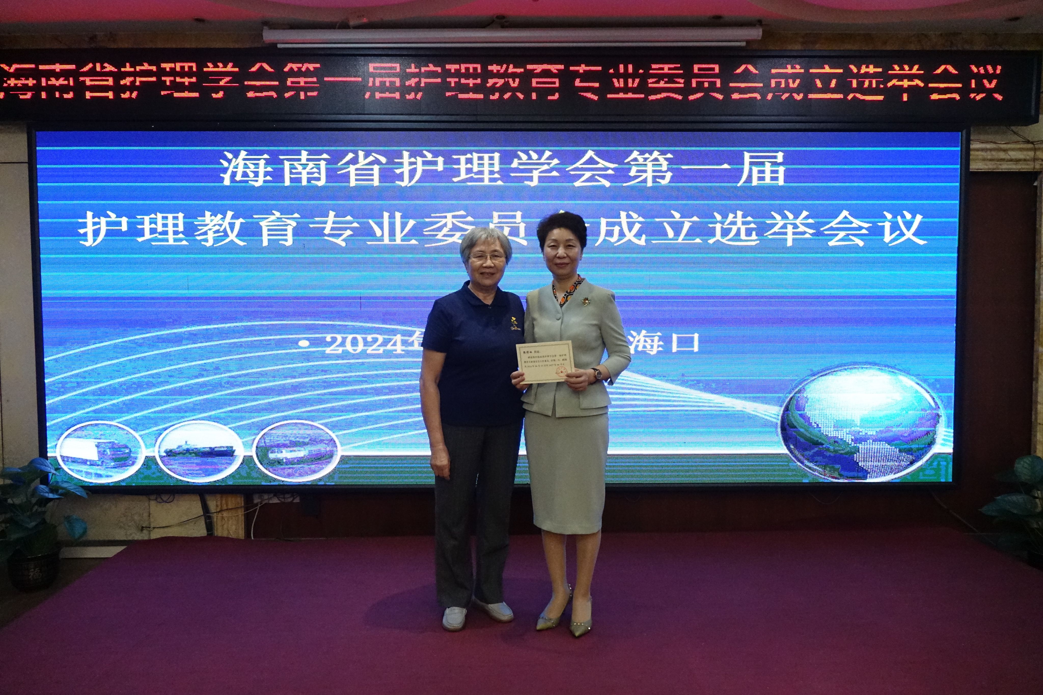 海南省护理学会冯玲同志为新当选的张彩虹主任委员颁发聘书,张彩虹主任委员分别为副主任委员、委员颁发聘书。