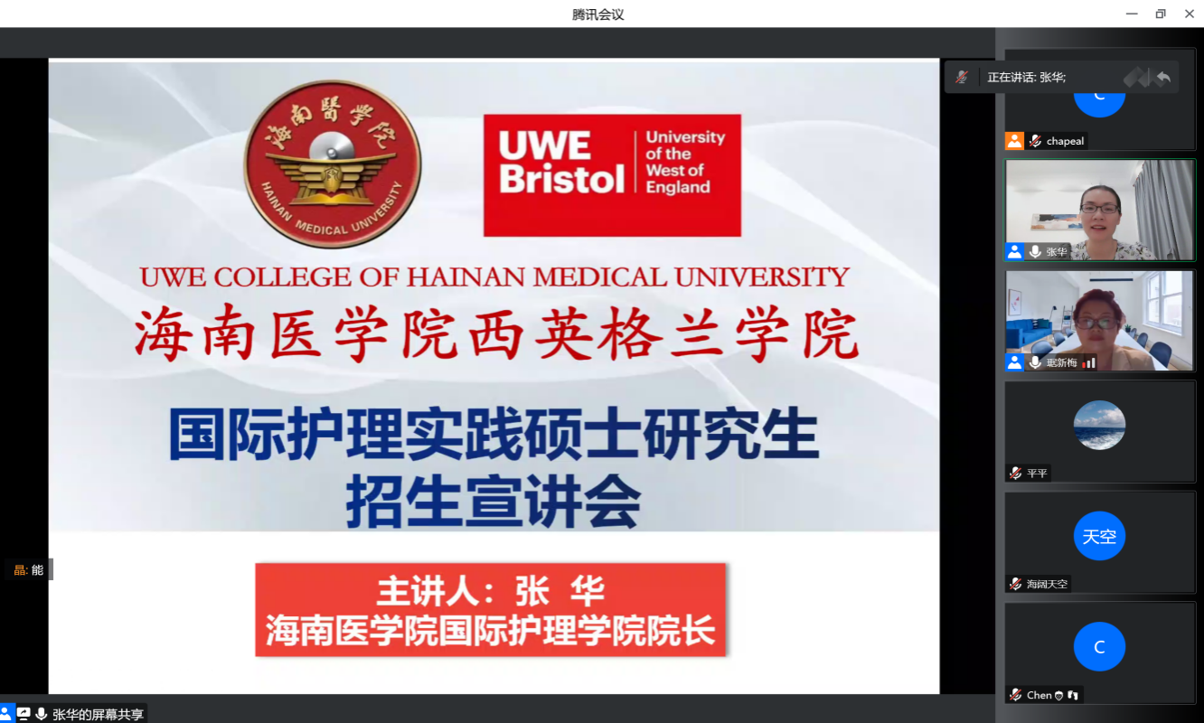 9月14日,海南医学院国际护理学院党委书记蒙伟、院长张华、副书记王涛、副院长郭洪花、副院长蔡小霞等与西英格兰学院党委书记张万科、副院长杨文君等召开中英合作办学项目护理专业招生工作推进会。会上大家对招生工作进行了充分的讨论,会后根据学校统一部署,我院积极筹备,通过认真调研,结合实际情况,初步确定招生人群为:涉外班学生、上届考研上线但未被录取考生、三家附属医院临床护士及今年准备报考护理硕士研究生的学生。学院广泛动员,线上线下有机结合,扎实推进各项招生宣传工作,并率先于9月16日举行了第一场国际护理实践硕士线上宣讲会,以积极推进英合作办学项目护理专业招生宣传工作。