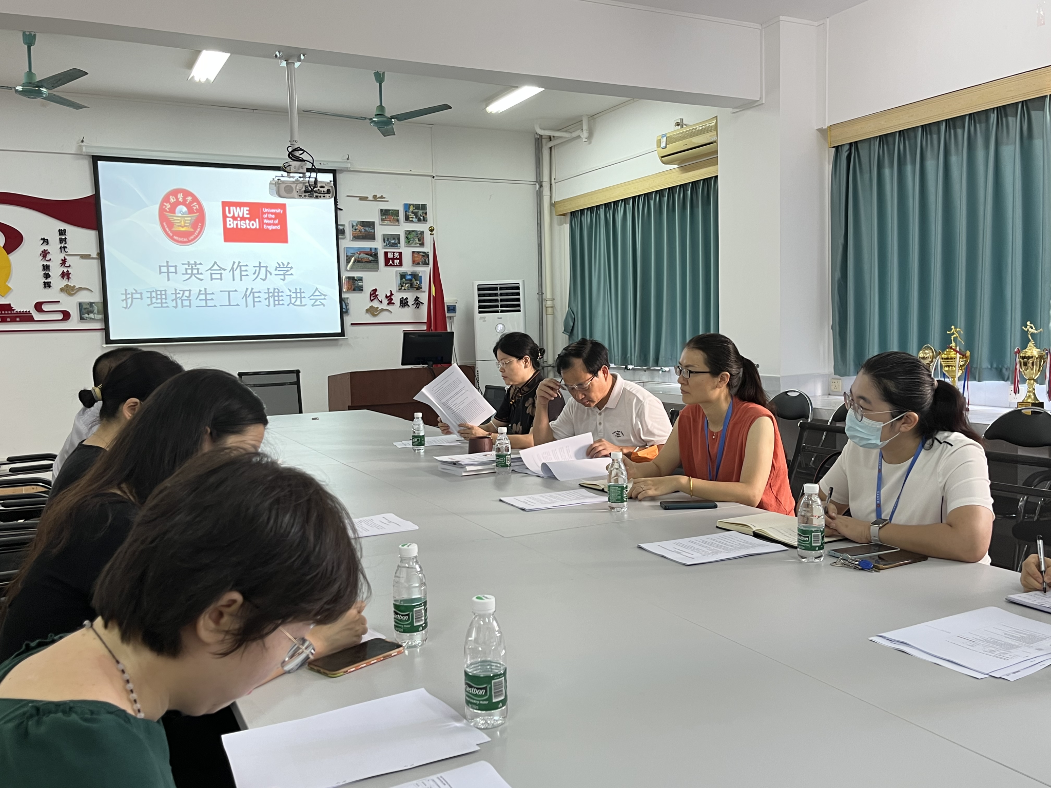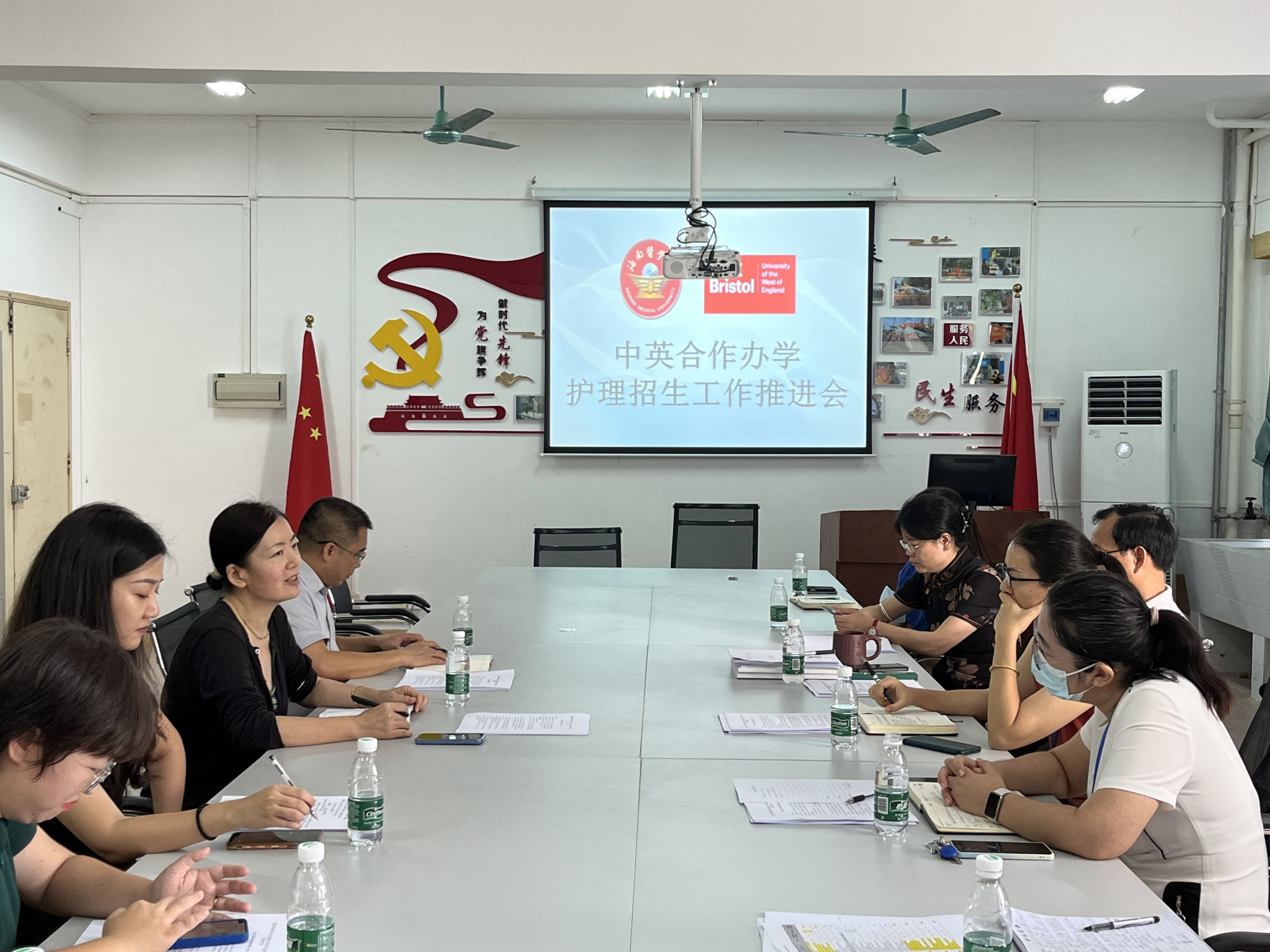 2022年9月14日上午,海南医学院西英格兰学院与国际护理学院在国际护理学院党建会议室举办了中外合作办学项目护理专业招生推进会。海南医学院西英格兰学院党委书记张万科、副院长杨文君等一行4人与国际护理学院党委书记蒙伟、院长张华、副书记王涛、副院长郭洪花和蔡小霞、综合办公室主任琚新梅等学院相关负责人及教师参加了本次会议。