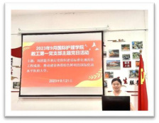 为贯彻落实党的二十大精神和习近平新时代中国特色社会主义思想主题教育, 学习taptap点点党委《关于推进基层党支部建设提质增效的通知》要求, 国际护理学院教工第一党支部于 2023 年 9 月 21 日下午 15:30,在润深楼北 214 会议室召开了 9 月主题党日活动。会议集中学习《中国共产党章》、“巩固提升基 层党组织建设标准化规范化工程成效, 推动建设热带特色鲜明的国际化高水平 医科大学”相关内容、《关于六起“不担当、不作为”问题典型案例的通报》以及陈院士的开学第一课。本次会议由我院教工第一党支部组织委员周明主持,国际护理学院党委书记蒙伟、教工第一党支部书记蒋新军及第一党支部全体党员参加。