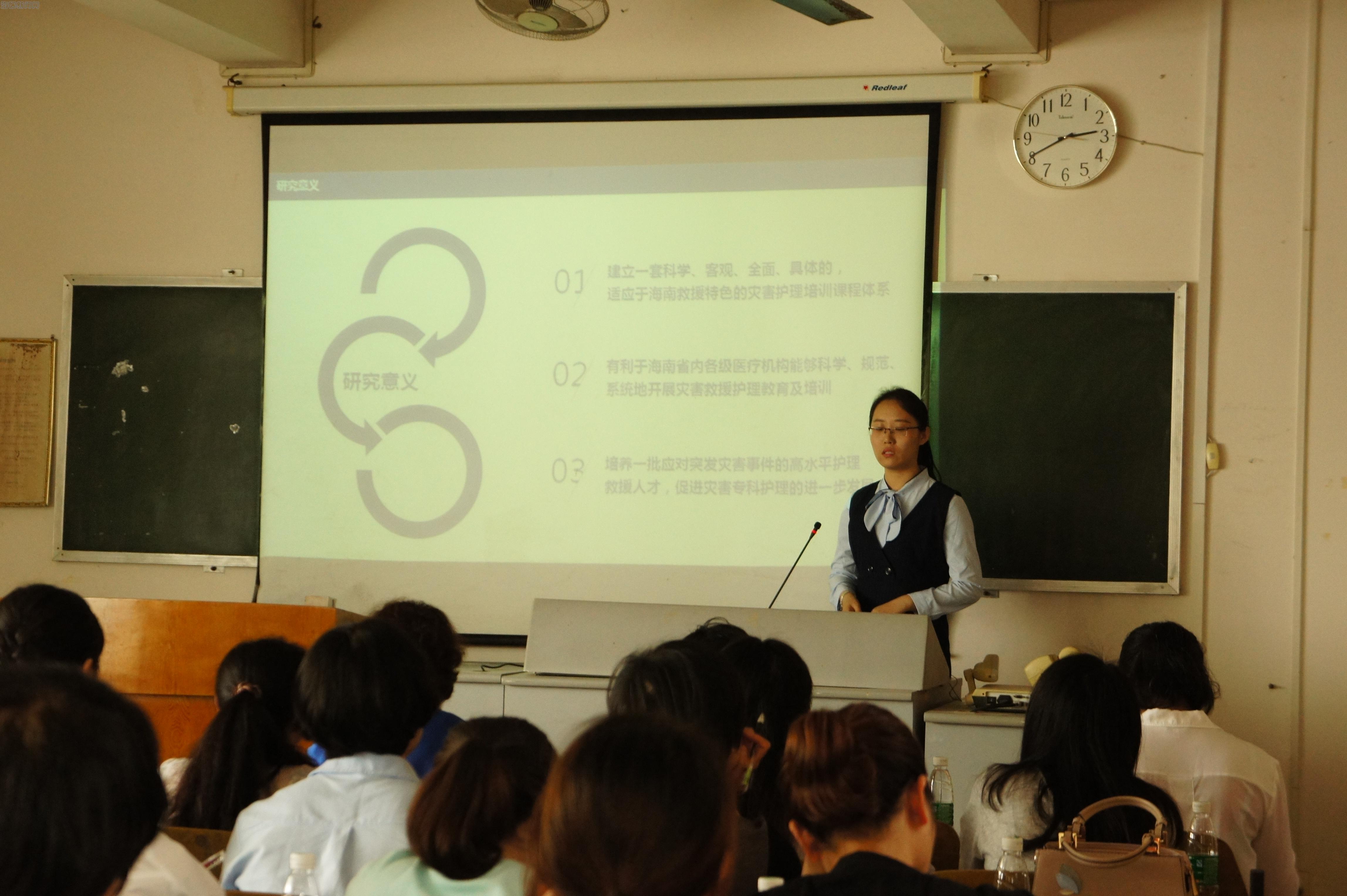 2017年3月22日下午2:30,国际护理学院2015级护理专业硕士学位论文开题报告答辩会在3-303举行。海南医学院科研处处长谢毅强教授、第一附属医院科研处处长李其富教授、吴玲教授、国际护理学院院长张彩虹教授以及学院研究生教学秘书郭洪花副教授担任本次开题报告讨论会的考评专家。参加此次讨论会的还有研究生专职导师、临床导师、学院教师以及全体护理研究生。